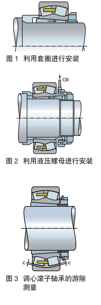 大型軸承,多用液壓工具進(jìn)行安裝作業(yè)。圖2是使用液壓螺母將襯套壓入的安裝作業(yè)例。另外,還有一種方法,是將加壓油通過(guò)襯套上所設(shè)的油孔注入配合面,用螺栓將襯套壓入。